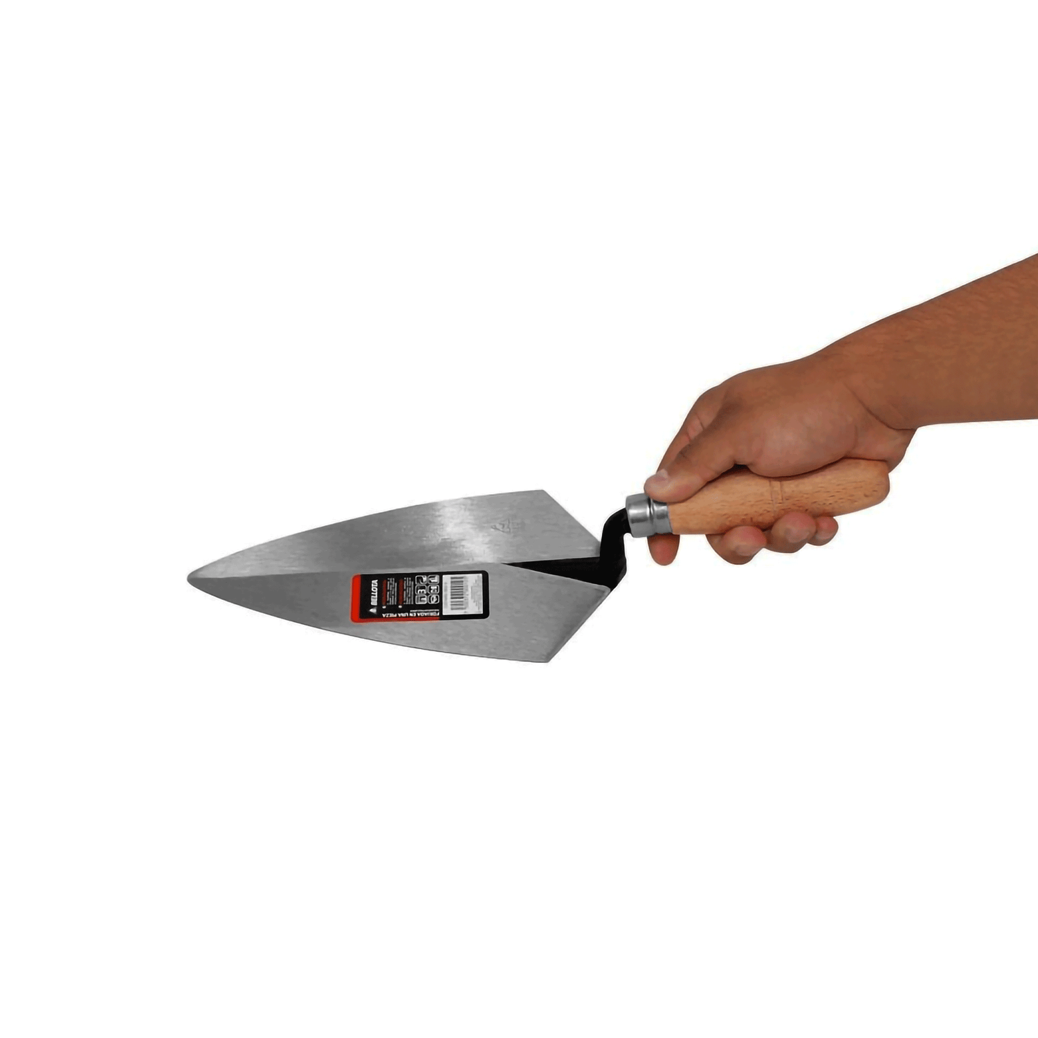 Cuchara utilizada en el sector de la construcción para tomar y aplicar mezcla en pequeñas cantidades en diferentes tipos de actividades. Tratamiento térmico en toda la hoja. Nervio de refuerzo en base y espiga con muescas que evita se gire el mango. Mango de madera de alta resistencia.