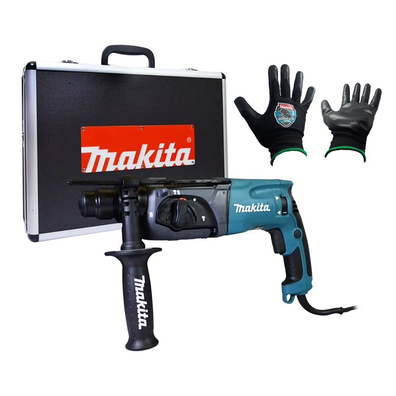 Combo de rotomartillo con broquero SDS Plus de Makita con mayor efectividad de perforación y percusión, gracias a las estrías en el sistema de sujeción de la broca, con velocidad variable y rotación reversible más guantes para protección marca Makita MKT9.