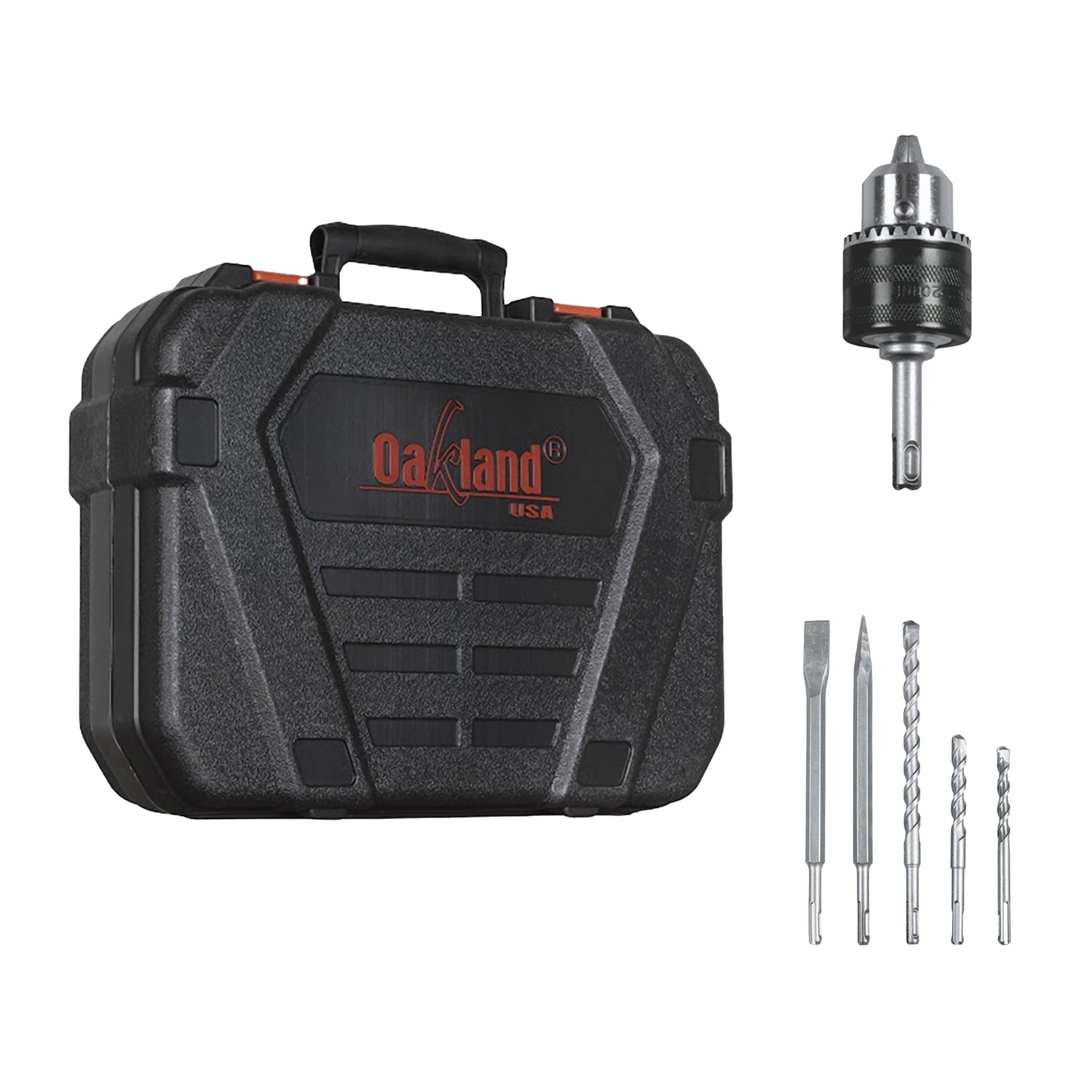 • Rotomartillo SDS Plus Oakland MR-3100 800 W 9000 RPM • Mango Porta Brocas • Broquero Adaptador 1/2” • 3 Brocas para Concreto • Cincel Punta • Cincel Plano • Chuck • Instructivo • Póliza de Garantía |