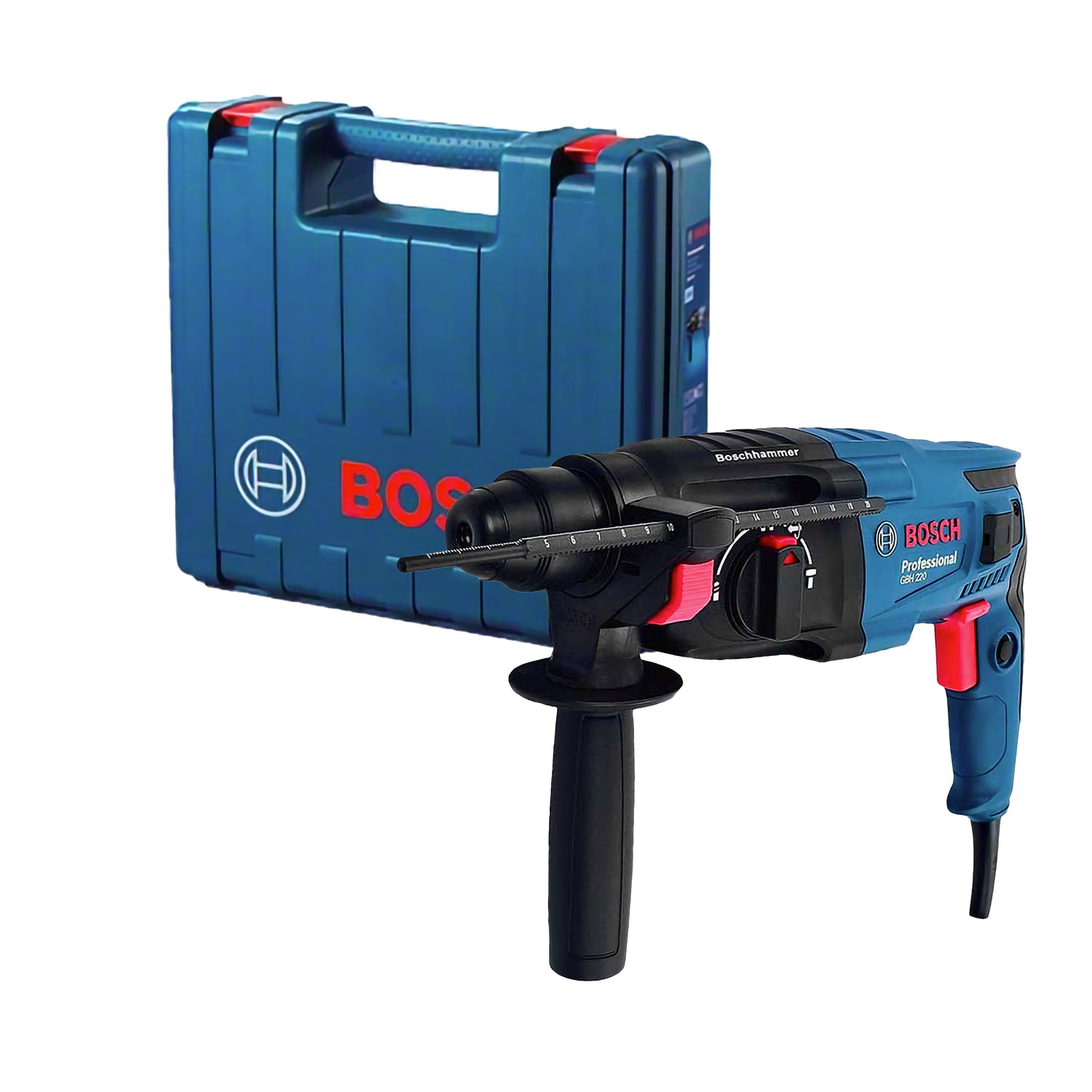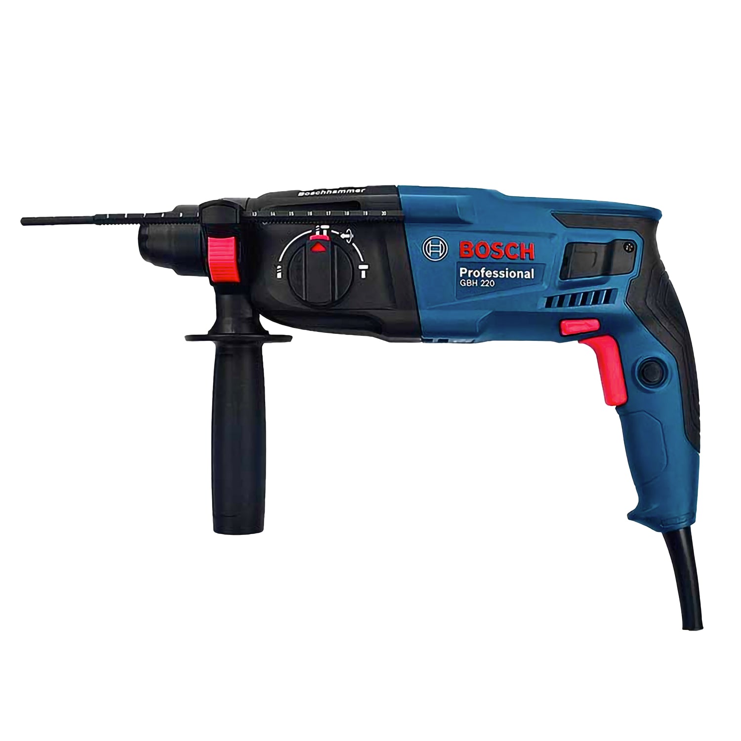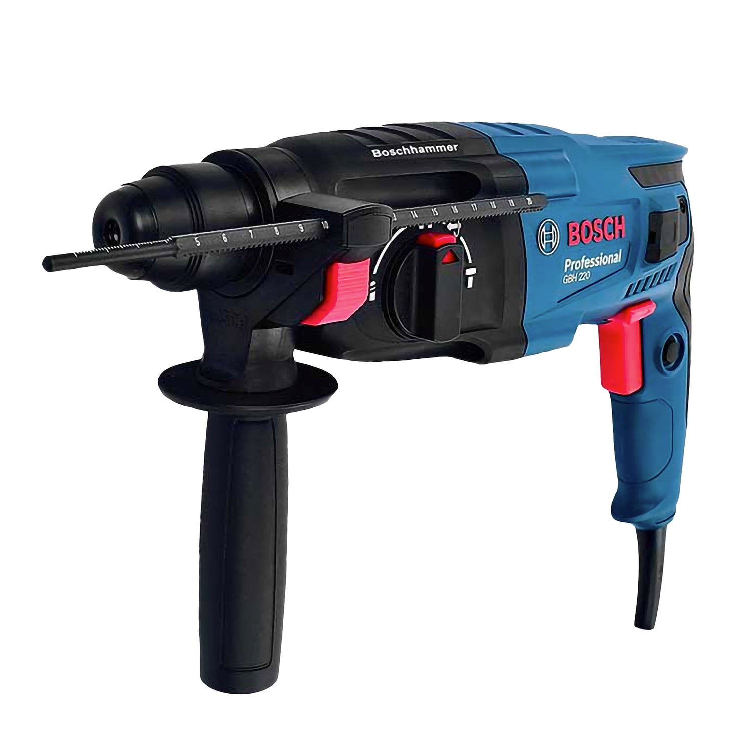 Rotomartillo SDS Plus GBH220 1300 RPM 720 W con tres modos de funcionamiento, para taladrar con percusión, taladrar y cincelar, para garantizar versatilidad y resultados satisfactorios. Potente motor de 720 W y 2,0 J de energía de impacto, para la perforación eficaz con percusión en hormigón. Este martillo perforador compacto pone el rendimiento de un martillo profesional Bosch a su alcance.